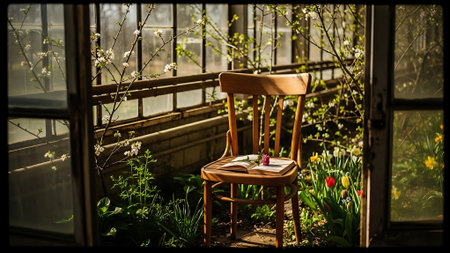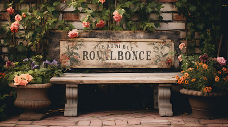 A charming bench nestled in a vibrant garden, surrounded by leaves and flowers, captured during golden hour, creating a serene atmosphere for relaxation.