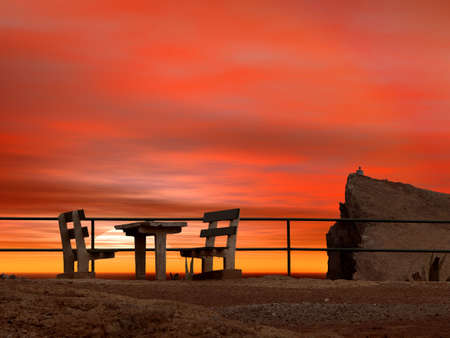 This image captures a serene and beautiful sunset with two chairs overlooking the calm ocean waters. Perfect for evoking feelings of peace and tranquility.