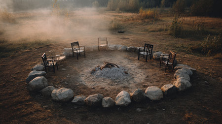 Outdoor campsite scene with no fire, stones in circular arrangement, ash in the center, empty chairs around, morning soft light atmosphere
