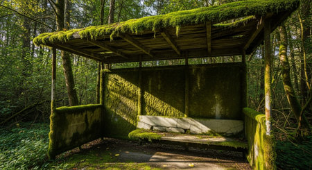 A peaceful, fog-shrouded bus stop stands in solitude, flanked by bare trees, evoking a sense of tranquility and isolation in the misty morning.