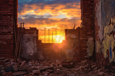 Rubble and debris surround a crumbling building in a war-torn urban landscape, depicting the devastating impact of conflict at sunset