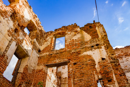 The walls of an old abandoned manor house of the 18th century, a view from inside. Belkino Manor, Russia