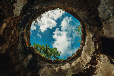 Looking up through a round hole in a derelict building reveals a vibrant sky filled with clouds and a tree peeking through, blending nature and history.