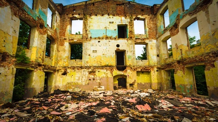 Old abandoned red brick house ruin, damaged by earthquake, war or other natural disaster, demolished decay debris, toned