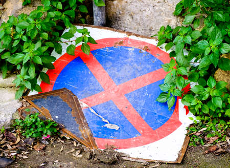 Old and broken traffic symbol No Parking on wall. Ideal for concepts and creative backgrounds. Space for text.