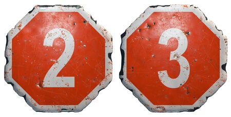 Set of numbers 2, 3 made of public road sign in red and white with a capital in the center isolated on white background. 3d rendering