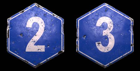 Set of public road signs in blue color with a white number 2 and 3 in the center on black background. 3d rendering