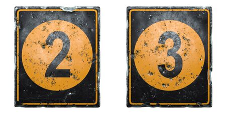 Set of public road sign orange and black color with a numbers 2 and 3 in the center isolated on white background. 3d rendering