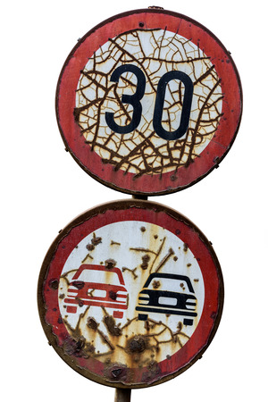 Old Rusty Road Sign Consumed by the Time. Traffic Sign Isolated on White Background.