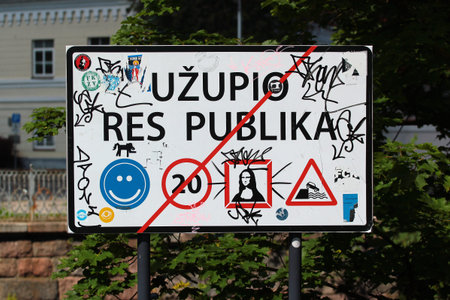 VILNIUS, LITHUANIA - JULY 14, 2017: Exit sign in the Republic of Uzupis, a bohemic neighborhood in Vilnius, popular among artists, musicians and other creative people.