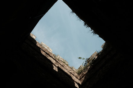 View from inside a medieval stone tower looking up at the blue sky, with plants growing on the upper edges of the walls. Ram Fortress, Serbia