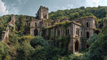 The remnants of a bygone era, this image encapsulates ancient ruins overtaken by nature, with columns and arches enveloped in lush green foliage.. AI Generation