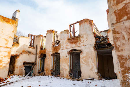 Remains of destroyed industrial building with internal communications. Demolition of building on territory plant. Background with dilapidated building and fragments of bricks and construction debris