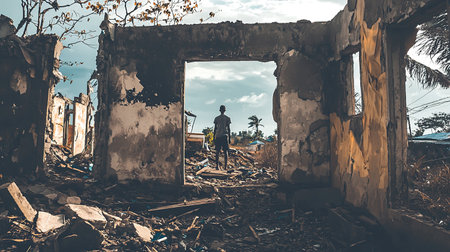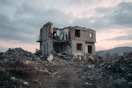 Rubble and debris surround a crumbling building in a war-torn urban landscape, depicting the devastating impact of conflict at sunset