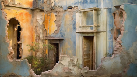 partially collapsed abandoned building, with visible signs of fire and water damage, created with generative ai