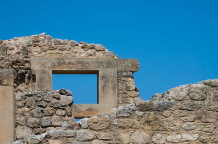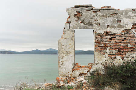 remains of ruined old brick house and window without glass with view of beautiful blue clear sea and mountains, selective focus
