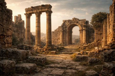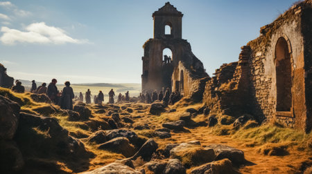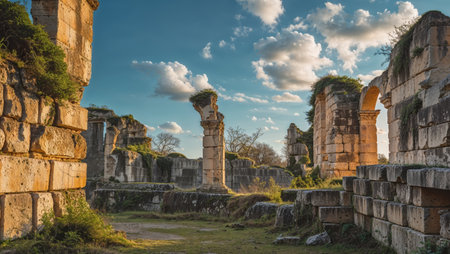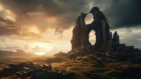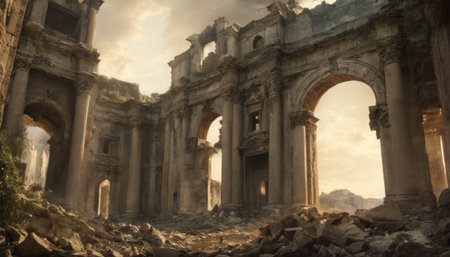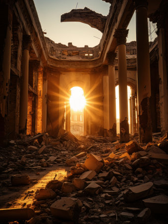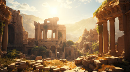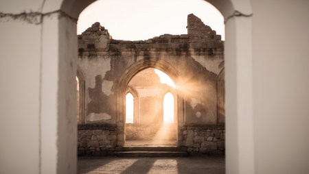 A hauntingly beautiful scene of ruins bathed in golden sunlight, capturing the serene contrast of decay against a bright sky. Perfect for those who find beauty in the passages of time. Generated A.I.