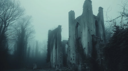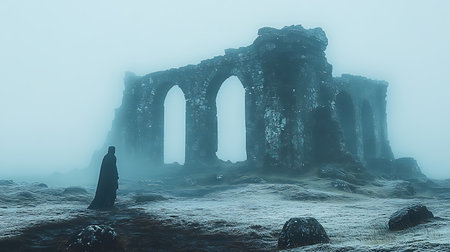 Generative AI Image of Man Silhouette in Robe Standing at Destroyed Old Building with Foggy Sky