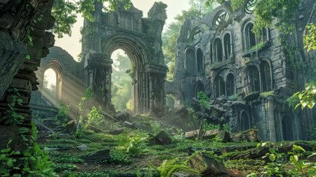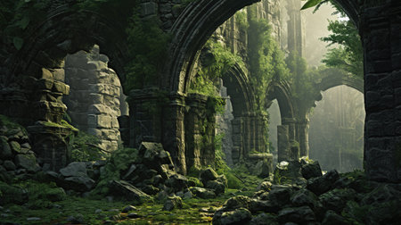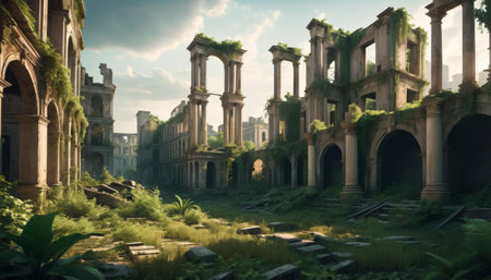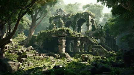 The remnants of a bygone era, this image encapsulates ancient ruins overtaken by nature, with columns and arches enveloped in lush green foliage.. AI Generation