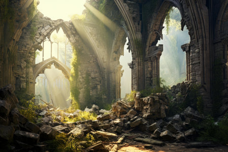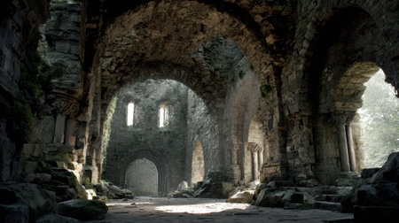 A ruined castle interior with crumbling stone archways and soft light, ancient and mysterious mood