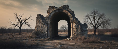 AI Generated. Decayed ancient archway leading into darkness in a desolate place