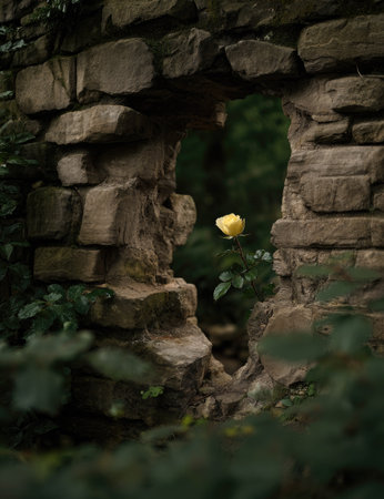 A stone wall with an archway frames a yellow rose. The image displays a textured stone structure with a detailed arrangement. The composition captures the rose in a natural setting. The image may be used for various commercial or editorial applications such as articles or advertising.