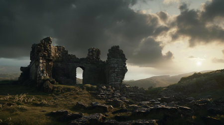 AI Generated. Crumbling walls of a forsaken structure under cloudy skies