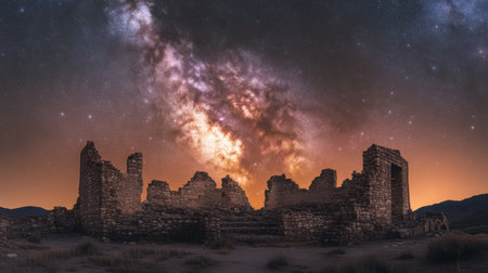 The Milky Way rising above ancient stone ruins, blending cosmic wonder with human history under a star-filled sky