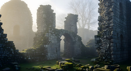 Misty Morning Light Casting Shadows on Medieval Castle Ruins