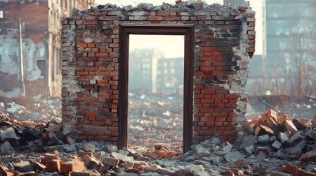 Lone doorway stands amidst the rubble and destruction of a building after a devastating earthquake, highlighting the destructive power of nature and the resilience of some structures