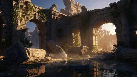 Ancient stone ruins with grand arches and fallen columns, bathed in warm sunlight. A reflective pool in the foreground is surrounded by overgrown vegetation.