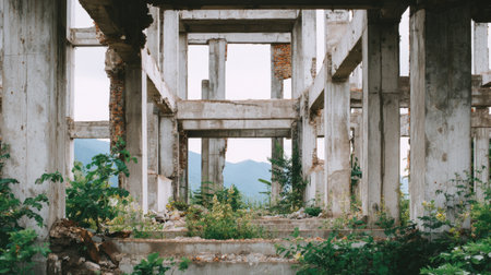 A striking image of an abandoned concrete structure overtaken by nature, surrounded by mountains and soft light, evokes feelings of decay and exploration.