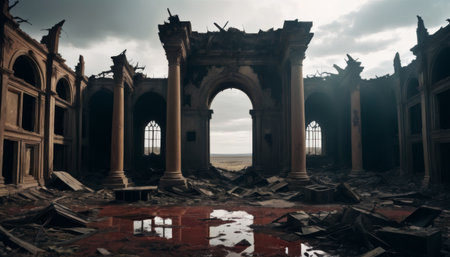 The grand remains of a once-opulent palace, now in ruins and partially flooded, under a stormy sky.. AI Generation