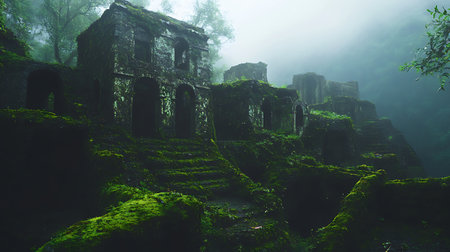 An ancient ruin on a misty mountain, with forgotten temples and overgrown paths. A mysterious fog envelops the scene, creating a sense of mystery and age. Resplendent.