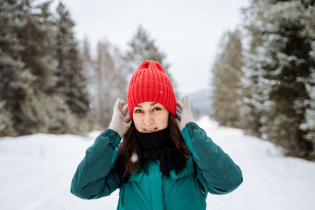Cheerful and smiling girl walking in the winter forest. Snowfall. Snow-covered forests. Walking in the winter season. Bright winter equipment