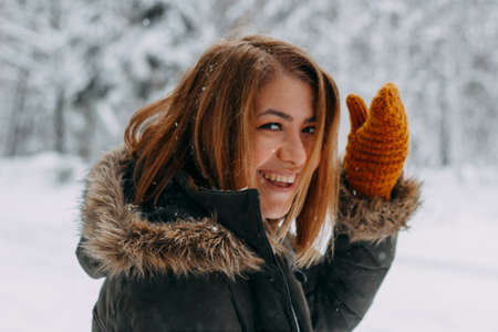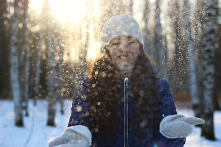 young woman in winter clothes playing with snow in the woods. The joy of winter, the girl throws into the air the fresh snow. selective focus, copy space