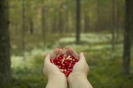 Process of collecting and picking berries in the forest of northern Sweden, Lapland, Norrbotten, near Norway border, girl picking cranberry, lingonberry, cloudberry, blueberry, bilberry and others