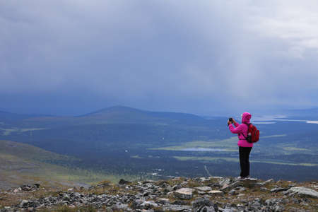 Nature photographer tourist with camera shoots while standing on the mountain.