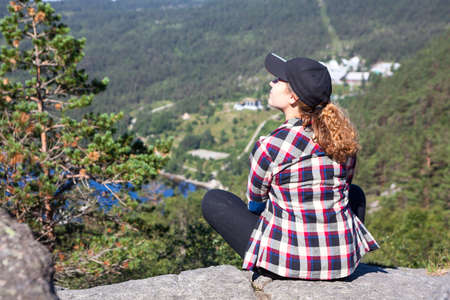 European woman hiker wearing in plaid shirt and cap sits on edge of cliff in mountains, copyspace