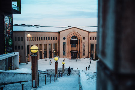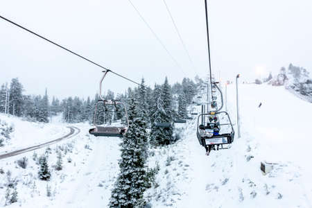 Ruka, Finland - November 24, 2012: Skiers are sitting on the chair ski lift at Ruka ski resort in freezing day.