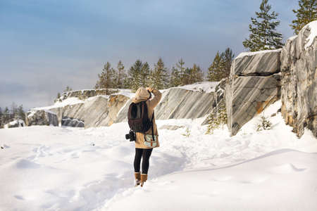 Professional female film photographer in Ruskeala marble quarry, Karelia, Russia