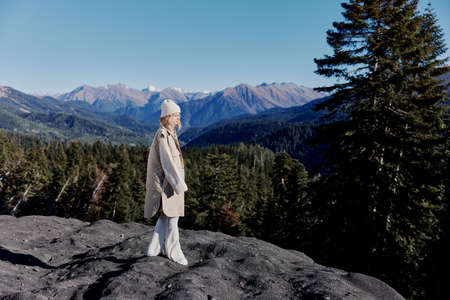 woman in autumn clothes stands on a rock landscape blue sky lifestyle