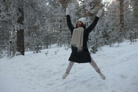 A young girl jumps with an asterisk in a winter snow-covered forest. The girl jumps and rejoices in the winter forest.