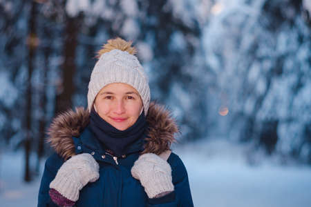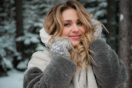 Charming young blonde girl on the background of snow-covered trees in the forest, close portrait.