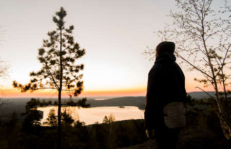 Autumn sunset at Lake Syvajarvi, in Hyrynsalmi, Finland. A young man in a plaid red and black shirt enjoys walking on a bridge at sunset. Kainuu region. Autumn in Scandinavia.