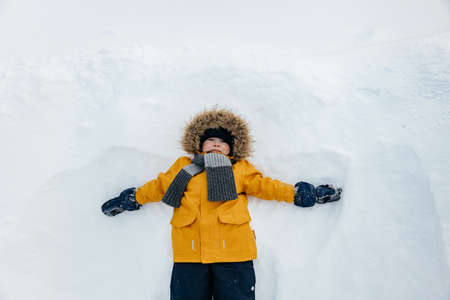 Cute little boy in an orange jacket with a fur hood is having fun lying in the snow. Winter outdoor activities for children. Top view
