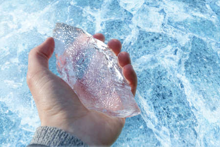 Ice in a man's hand against a background of blue broken ice. Soft focus. Freezing concept.
