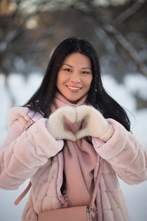 Beautiful Asian shows heart gesture, Winter Park on background. Smiling woman with flowing hair, dressed in a pink jacket and a mitten show love sign for photocamera.
