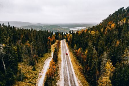 Aerial view of first snowy autumn color forest in the mountains and a road with red car in Finland Lapland.