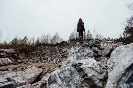 Portrait of a girl on the rocks against background stones. Autumn clothes. Landscape, wide angle